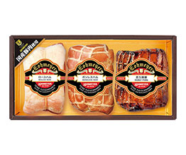ハムと彩り豊かな野菜のゼリー寄せ「アスピーク」、豚もも肉に粗挽きのブラックペッパーをまぶして香り高く燻煙したボンレスハムを詰め合わせました。
