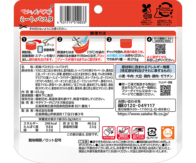 ◇コクのあるソースと、ミートのうま味が絶妙なバランスで調和しています。◇軽量で長期保存が可能な便利なパスタです。お湯を入れて3分でお召し上がり頂けます。◇非常食、アウトドア、海外旅行に便利にお使い頂けます。