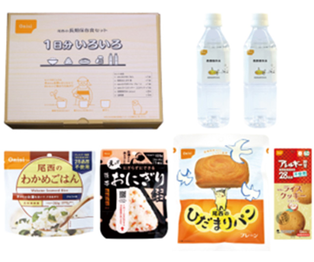 - @ 尾西のわかめごはん 1袋 100g A 携帯おにぎり 鮭 1袋 42g B 尾西のひだまりパン プレーン 1個 C 尾西のライスクッキー ココナッツ 1個 8枚 D 長期保存水 500ml×2本 E 説明書 1枚