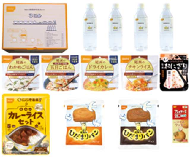- @ 尾西のわかめごはん 1袋 100g A 尾西のアレルギー対応五目ごはん 1袋 100g B 尾西のドライカレー 1袋 100g C 尾西のチキンライス 1袋 100g D 携帯おにぎり 鮭 1袋 42g E CoCo壱番屋監修尾西のカレーライスセット 1袋 260g F 尾西のひだまりパン プレーン 1袋 1個 G 尾西のひだまりパン チョコ 1袋 1個 H 尾西のライスクッキー ココナッツ 1箱 8枚 ? 長期保存水 500ml×4本 J 説明書 1枚