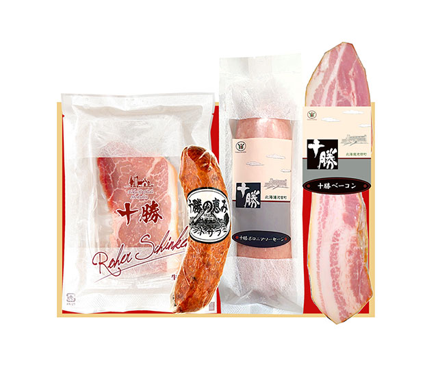 - 十勝ベーコン180g×1、恵みソフトサラミ90g×1、十勝ボロニアソーセージ250g×1、十勝モモ生ハム40g×1