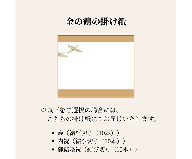 ※この商品は、「寿(結び切り(10本))」「内祝(結び切り(10本))」「御結婚祝(結び切り(10本))」の掛け紙をご選択の場合、ブランドが用意している<金の鶴の掛け紙>をおかけいたします。
