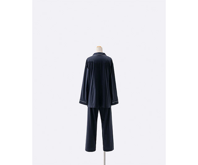 80番手の細糸を2本撚り合わせた双糸を36ゲージで編みあげた、上品で繊細な仕上がりが魅力。伸縮性のある生地と締め付け感をできるかぎり抑えたデザインは、快適で心地良い睡眠を誘います。生地に適度な厚みを持たせることでオールシーズン使える仕様にし、表面の微光沢で華やかさをプラスしました。