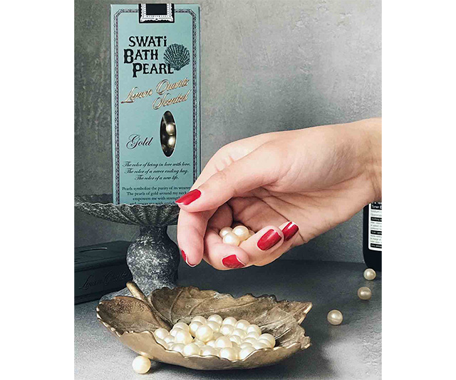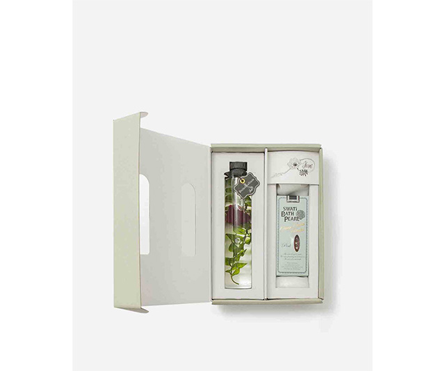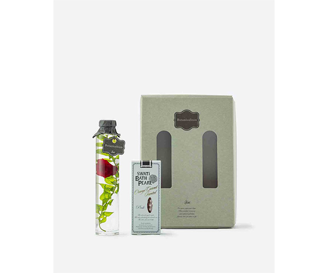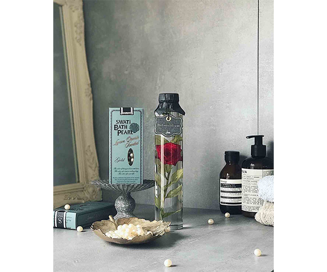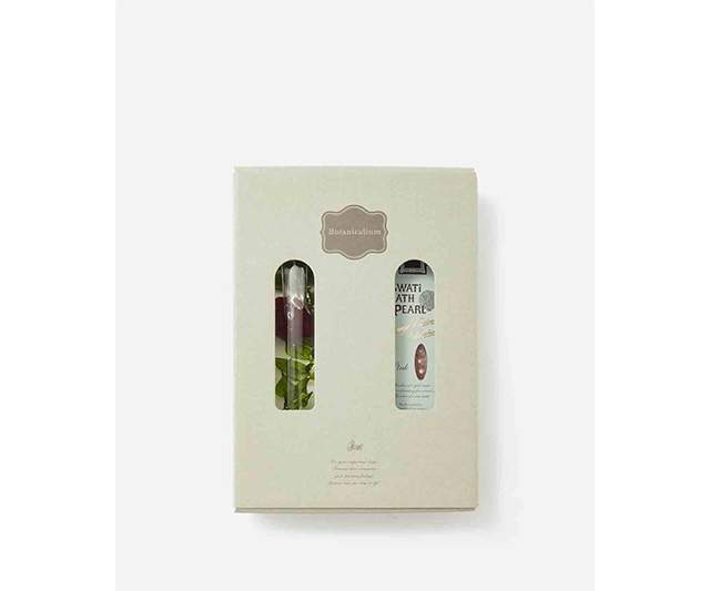 植物の美しさを、液体の中に閉じ込めた<パコス>のボタニカリウムと、パールをモチーフにした<スワティ>のバスパールがセットに。ボタニカリウムは、液体の中をゆらりゆらりと浮かぶ花が印象的なインテリア小物。ガラス瓶の中でお花がゆらゆらと揺れ、角度や光の加減であらゆる表情を見せてくれます。空気に触れないのでお花の鮮やかさや鮮度を長く保つことができます。バスパールは、パールが浮かぶバスタイムを楽しめる浴用剤。まるで薔薇の花束に包まれているような、高貴なローズベースの香りです。湯船の中で徐々に溶け出し、香りがバスルームいっぱいに広がります。 また、お湯は乳白色になり、しっとりなめらかなお肌に仕上げてくれます。