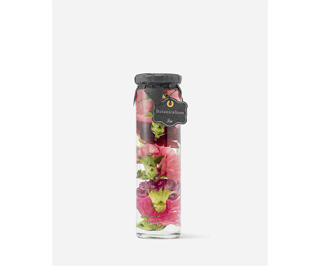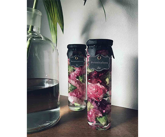 植物の美しさを、液体の中に閉じ込めたボタニカリウム。ガラス瓶の中でお花がゆらゆらと揺れ、角度や光の加減であらゆる表情を見せてくれます。空気に触れないのでお花の鮮やかさを長く保つことができるのが特徴。こちらは、贅沢にカーネーションが揺れるデザインです。