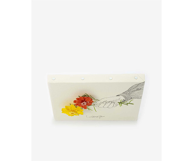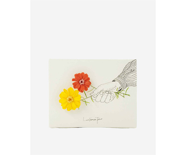 花という手紙を贈る。新たな花贈りのカタチ。レターフラワーは、壁に立てかけたり、イーゼルや額に飾ってインテリア小物としてお花を楽しめるアイテムです。キャンバス地に描かれたイラストと、お花のコラボレーションをお楽しみください。こちらの商品は、花束を手渡している瞬間をキャンバスに表現した作品です。シャツに隠れた「SMILE」のメッセージと一緒に、あなたの気持ちをお届けします。