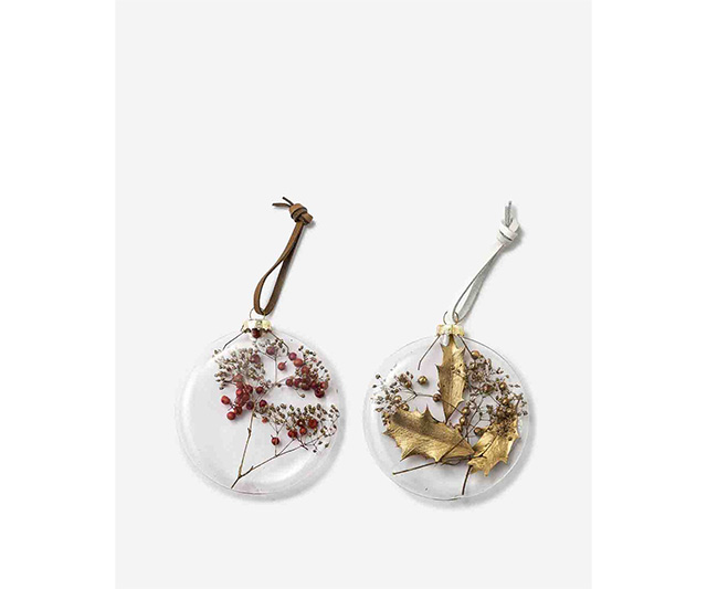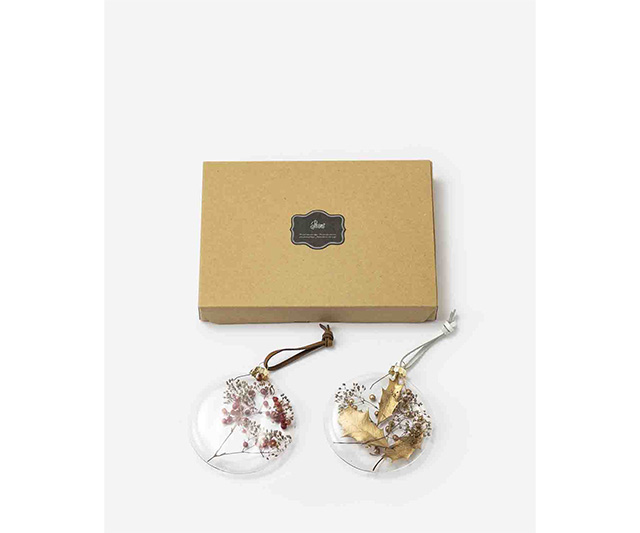 平たいガラスに、ドライフラワーやプリザーブドフラワーをアレンジしたオーナメントのセット。透き通ったガラスの美しさとナチュラルな植物のコントラストが印象的で、お部屋のいろいろな場所に気軽に飾ることができるおしゃれなアイテムです。