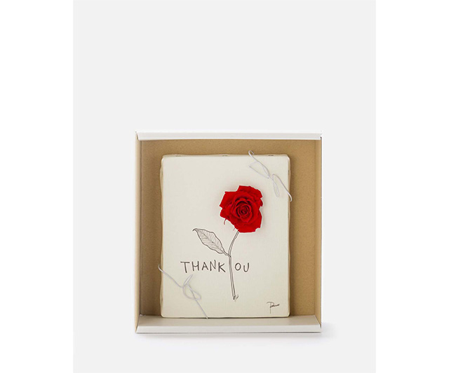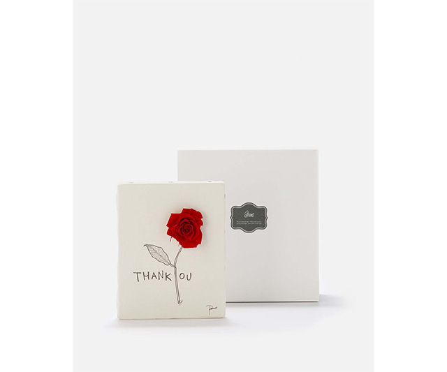 花贈りの新しいカタチ「レターフラワー」は、キャンバス地に描かれたイラストとフラワーのコラボレーションが美しい、花の手紙です。感謝の気持ちをレターフラワーに乗せてお届けします。壁に立てかけたりイーゼルや額に飾ったりと、空間のアクセントとしても楽しめます。「THANK YOU」のYの文字をローズのお花で表現したユニークな作品です。