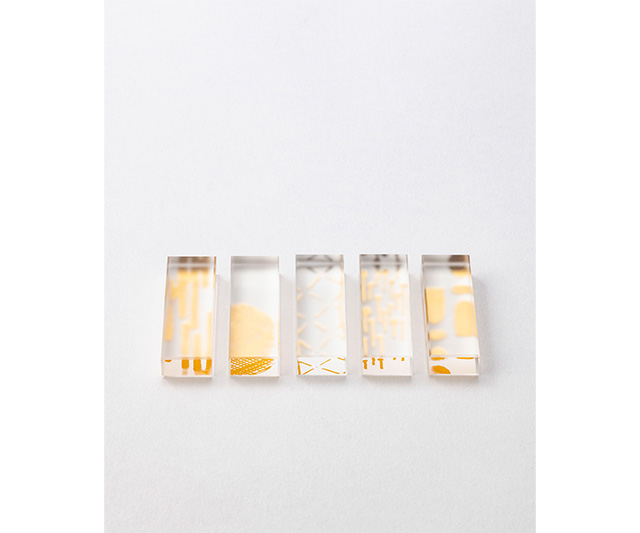 クリアなアクリル素材と金色の箔のコントラストが食卓に華を添える箔シリーズ。和・洋どちらの食器にも合わせやすい、美しく使い勝手の良い箸置きです。和の要素を大切に、1点ずつ自然をモチーフに名付けられています。磨りガラスのようなマットな表面は裏面の金色の箔を上品に映し、透明度の高さを生かした側面は奥行きを生み出します。角度によって異なる表情を楽しめます。軽く持ち運びに便利な点も魅力です。