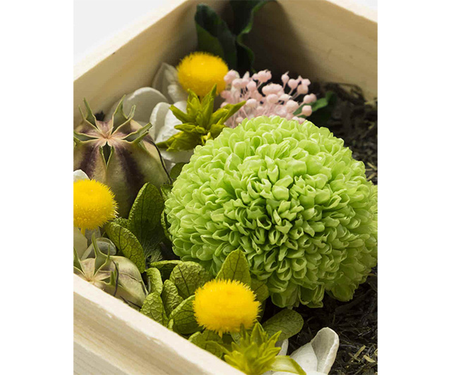京都宇治の宇治茶は、日本三大銘茶の一つでもあり、世界でも親しまれています。特に繊細なお茶の香りは、宇治茶の魅力の一つ。ただ厳しい品質管理のもと、市場に卸されない茶葉があります。そこで、プリザーブドフラワーと組み合わせることで、立てて飾ることもできる、新しい観賞用造形フラワーをつくりました。木箱の中にそっと大切におさめた、ほのかな香りと共に京都宇治を感じることができます。京阪宇治駅をモチーフにした「宇治駅」は、宇治の連なる茶畑に着想を得て、デザインされています。
