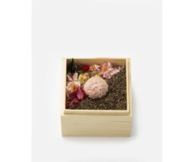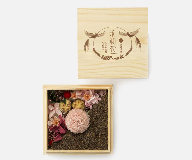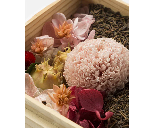 京都宇治の宇治茶は、日本三大銘茶の一つでもあり、世界でも親しまれています。特に繊細なお茶の香りは、宇治茶の魅力の一つ。ただ厳しい品質管理のもと、市場に卸されない茶葉があります。そこで、プリザーブドフラワーと組み合わせることで、立てて飾ることもできる、新しい観賞用造形フラワーをつくりました。木箱の中にそっと大切におさめた、ほのかな香りと共に京都宇治を感じることができます。京阪宇治駅をモチーフにした「宇治駅」は、宇治の連なる茶畑に着想を得て、デザインされています。