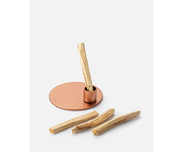 「パロサント」はスペイン語で「聖なる木(Holy、Wood)」という意味を持つ南米原産の香木。火を灯したパロサントをそのままインテリアとして楽しむことができる銅製の専用プレートとセットにしました。エクアドルの職人がすべて手斧でカットしたパロサントには香りが最大限に残り、火をともさないときにも濃厚な甘い香りが楽しめます。これからパロサントを始めたい方も気軽に使えるおすすめのセットです。