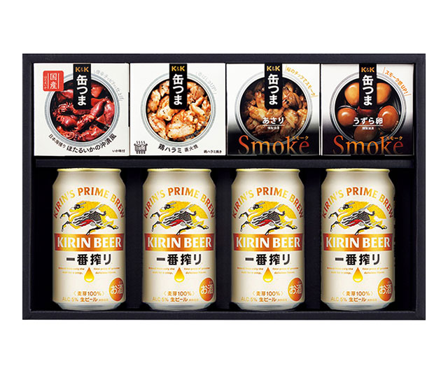 - 一番搾り350ml×4、缶つま(日本海獲りほたるいかの沖漬風70g・鶏ハラミ直火焼50g×各1)、缶つまSmoke(あさり40g・うずら卵25g×各1)/プルトップ缶