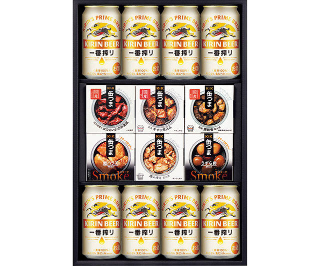 - 一番搾り350ml×8、缶つま(日本海獲りほたるいかの沖漬風70g・鶏ハラミ直火焼50g・国産豚軟骨直火焼40g・国産牛すじ煮込み75g×各1)、缶つまSmoke(鮭ハラス50g・うずら卵25g×各1)/プルトップ缶