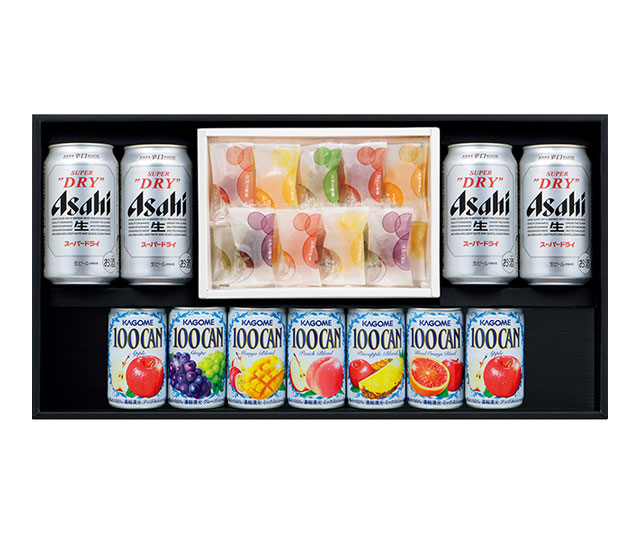 - 〈アサヒ〉スーパードライ350ml×4、〈カゴメ〉100CAN(グレープ・マンゴーブレンド・ピーチブレンド・パインアップルブレンド・ブラッドオレンジブレンド×各1、アップル×2、各160g)、〈彩果の宝石〉フルーツゼリー(15種計19)×1