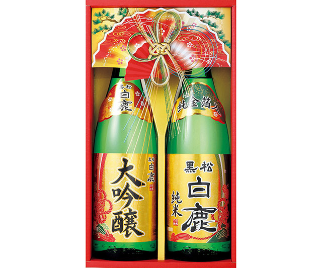 縁起のよい末広がりの扇が華やかな〈黒松白鹿〉の迎春セット。白鹿伝承の蒸米仕込みで醸した、豊かなコクを愉しめる純金箔入り純米酒とフルーティな吟醸香と爽やかな味わいのお酒です。