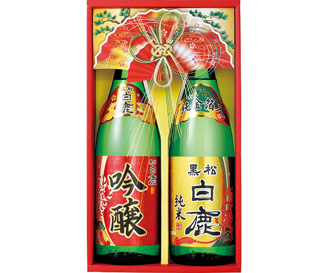 縁起のよい末広がりの扇が華やかな〈黒松白鹿〉の迎春セット。白鹿伝承の蒸米仕込みで醸した、豊かなコクを愉しめる純金箔入り純米酒とフルーティな吟醸香と爽やかな味わいのお酒です。