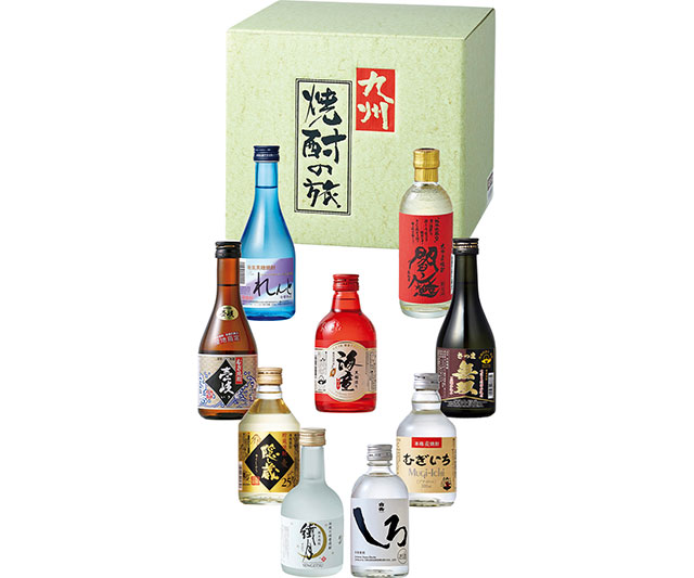 - 九州の焼酎9銘柄 25度麦焼酎(長崎)・25度麦焼酎(大分)・16度黒糖焼酎(鹿児島)×各1、25度麦焼酎(鹿児島)・25度米焼酎(熊本)・25度芋焼酎(鹿児島)×各2、各300ml