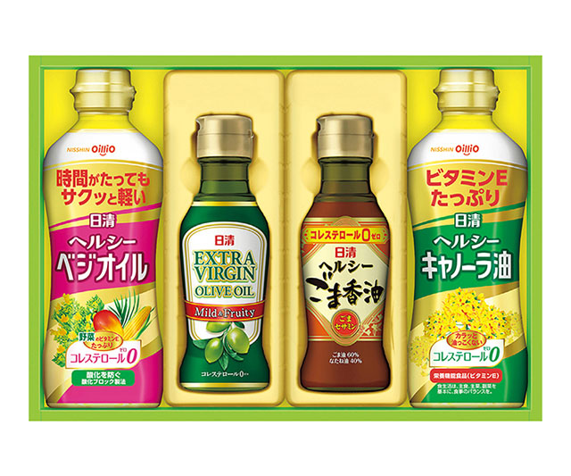 - ヘルシーキャノーラ油(栄養機能食品)・ヘルシーべジオイル各350g、エキストラバージンオリーブオイル・ヘルシーごま香油各145g