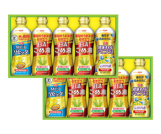 - こめ油×6、MCTリセッタ(特定保健用食品)・健康オイルアマニプラス(機能性表示食品/届出番号:A82)×各2、各350g