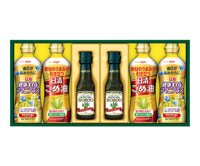 機能性表示食品「健康オイルアマニプラス」や、素材の旨みを引き立てる「こめ油」、まろやかな味わいの「ボスコオリーブオイル」が入ったオイルギフトです。