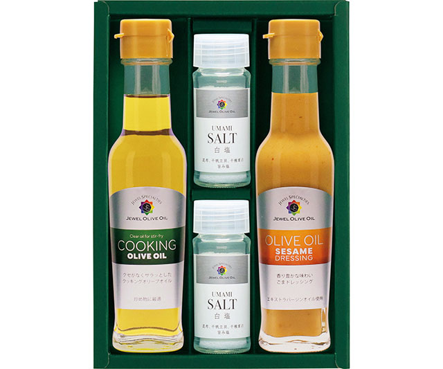 - クッキングオリーブオイル100g×1/スペイン製、ごまドレッシング110ml×1、旨み塩(白塩)30g×2/日本製