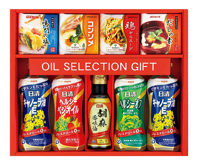 - 日清ヘルシーオフ350g・日清ヘルシーべジオイル350g・日清胡麻香味油145g×各1、日清キャノーラ油E350g×2、マルトモだしの素(4g×6袋)・鳴門の塩80g・鶏がらスープ(20g×2袋)・コンソメ(20g×2袋)×各1