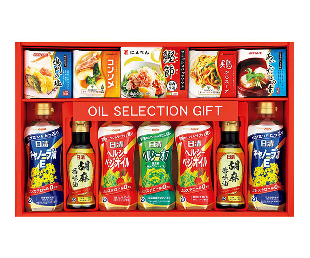 - 日清ヘルシーオフ350g×1、日清ヘルシーべジオイル350g・日清キャノーラ油E350g・日清胡麻香味油145g×各2、鳴門の塩80g・マルトモあごだしの素(4g×6袋)・鶏がらスープ(20g×2袋)・コンソメ(20g×2袋)・にんべん鰹節(1.5g×3袋)×各1