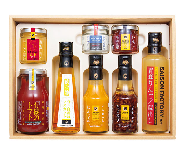 - りんごジャム100g、有機のトマトケチャップ300g、飲む酢マスカット160ml、チーズディップ50g、リッチスタイルジャムいちご70g、リッチスタイルドレッシング(にんじん・たまねぎ各140ml)、りんごジュース270g