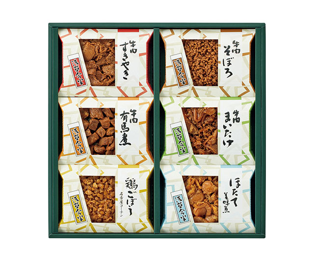 角切り牛肉を山椒で煮た「牛肉有馬煮」、繊維質豊かで上品な風味の「牛肉まいたけ」など、素材の味を活かした佃煮を詰め合わせました。