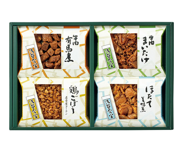 角切り牛肉を山椒で煮た「牛肉有馬煮」、繊維質豊かで上品な風味の「牛肉まいたけ」など、素材の味を活かした佃煮を詰め合わせました。