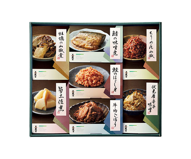 - ちりめん山椒・筍土佐煮・鮭のほぐし身・牡蠣の山椒煮各40g、牛肉ごぼう50g、伏見唐辛子味噌60g、鯖の味噌煮70g