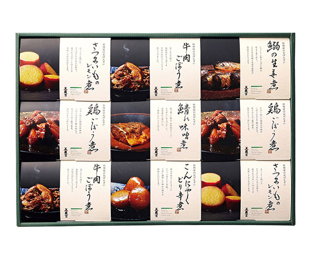 - 鯖の味噌煮70g・鰯の生姜煮70g・こんにゃくピリ辛煮(5個入)×各1、鶏ごぼう煮70g・さつまいものレモン煮70g・牛肉ごぼう煮60g×各2