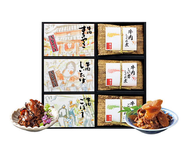 〈浅草今半〉牛肉すきやき・牛肉しいたけ・牛肉ごぼう各60g、〈柿安〉牛肉しぐれ煮・牛肉しい茸しぐれ煮・牛肉ごぼうしぐれ煮各50g