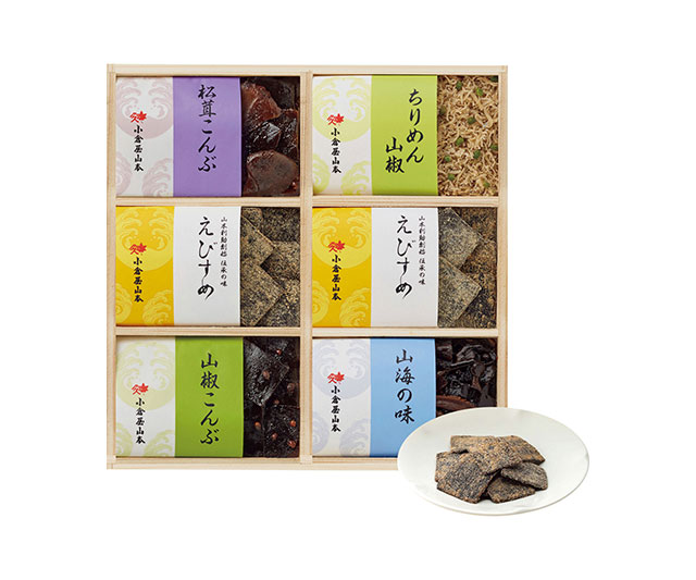 - えびすめ45g×2、ちりめん山椒25g・松茸こんぶ60g(松茸は中国産)・山椒こんぶ60g・山海の味60g×各1