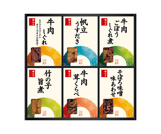 牛肉ごぼうしぐれ煮・牛肉しぐれエクストラバージンオリーブオイル仕立て・牛肉茸くらべ・竹の子旨煮各50g、帆立うすだき40g、そぼろ味噌味あわせ90g