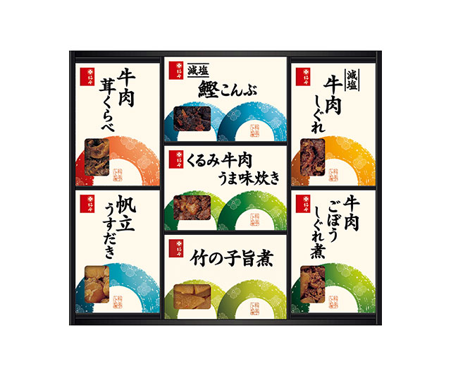 減塩牛肉しぐれ・牛肉ごぼうしぐれ煮・牛肉茸くらべ・くるみ牛肉うま味炊き・減塩鰹こんぶ・竹の子旨煮各50g、帆立うすだき40g