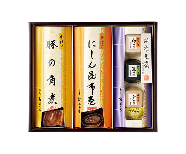 - にしん昆布巻80g・豚の角煮100g×各1、胡麻豆腐(白・黒・金各43g×各1、柚子味噌たれ×3)