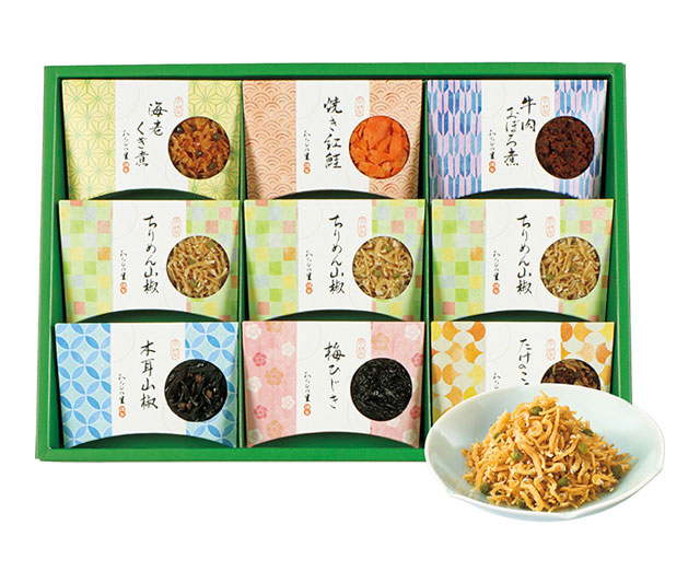 ちりめん山椒20g×3、焼き紅鮭・牛肉おぼろ煮・海老くぎ煮各20g×各1、木耳山椒・梅ひじき各30g×各1、たけのこ昆布25g×1