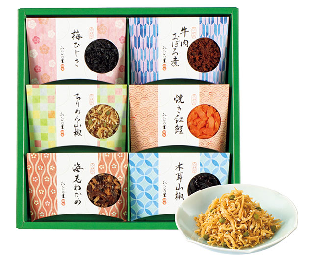 ちりめん山椒・焼き紅鮭・牛肉おぼろ煮各20g、木耳山椒・梅ひじき・海老わかめ各30g