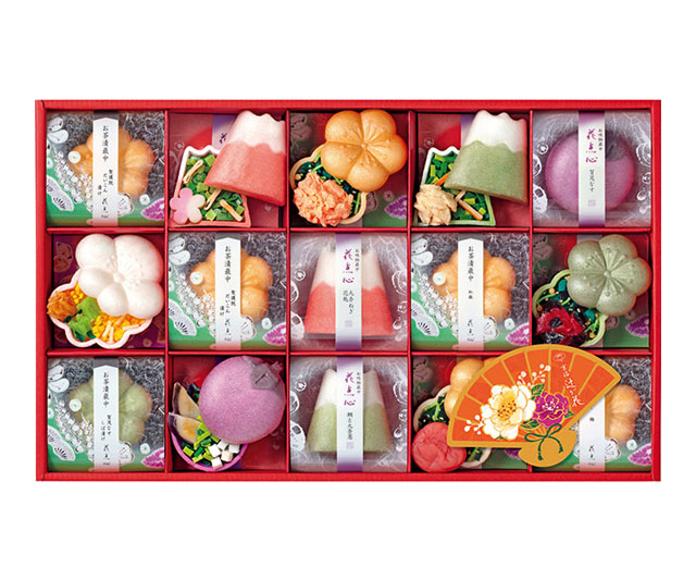 赤富士、青富士などをかたどった香ばしい最中に、京野菜や山海の幸を入れたお茶漬とお吸物を詰め合わせました。上品な京風の味わいを艶やかな最中と一緒にご賞味ください。
