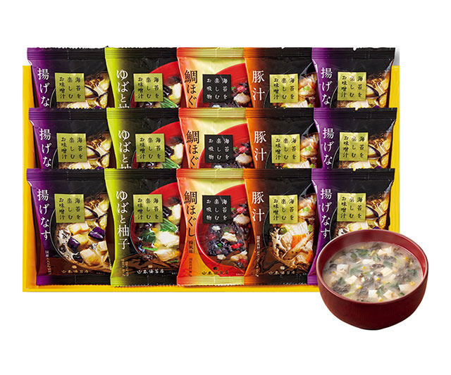 数種類の味噌を海苔に合うようブレンドしたお味噌汁とお吸い物の詰合せです。お湯を注ぐだけで、国産豚を使用した「豚汁」や上品な味わいの「ゆばと柚子」などをお楽しみいただけます。