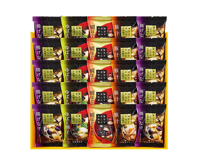 数種類の味噌を海苔に合うようブレンドしたお味噌汁とお吸い物の詰合せです。お湯を注ぐだけで、国産豚を使用した「豚汁」や上品な味わいの「ゆばと柚子」などをお楽しみいただけます。