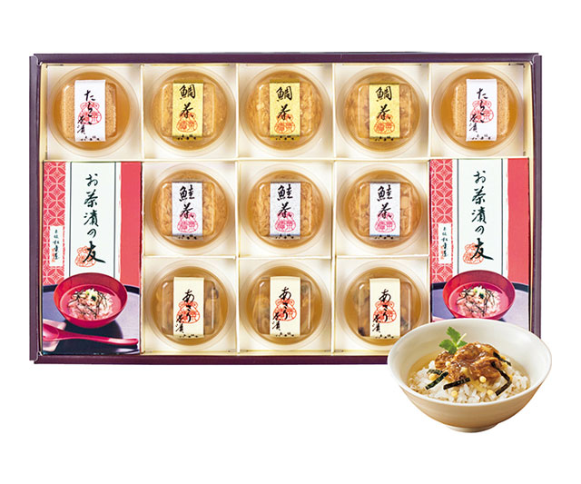 鯛茶漬・鮭茶漬・あさり茶漬×各3、たらこ茶漬×2、各42g、お茶漬の友(海苔・あられ)×11