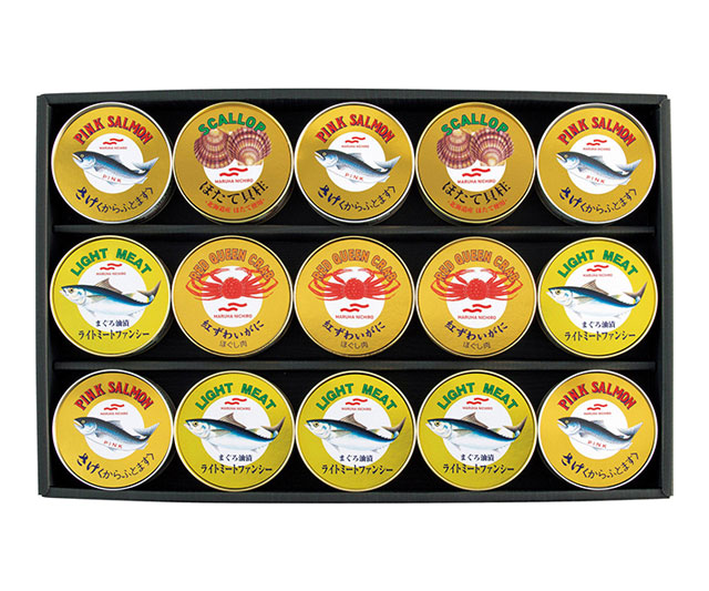 紅ずわいがにほぐし肉60g×3、ほたて貝柱95g×2、さけ水煮・まぐろ油漬各90g×各5/プルトップ缶