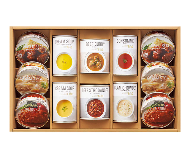- ハンバーグデミクリームソース95g・チキンクリームシチュー100g・牛肉のデミグラスソース煮100g×各2、ビーフカレー・ビーフストロガノフ各200g×各1、コンソメ・クラムチャウダー・コーンクリームスープ・パンプキンクリームスープ各160g×各1/プルトップ缶
