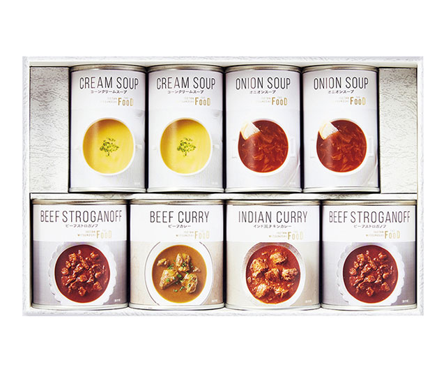 - ビーフストロガノフ200g・コーンクリームスープ160g・オニオンスープ150g×各2、ビーフカレー・インド風チキンカレー各200g×各1/プルトップ缶