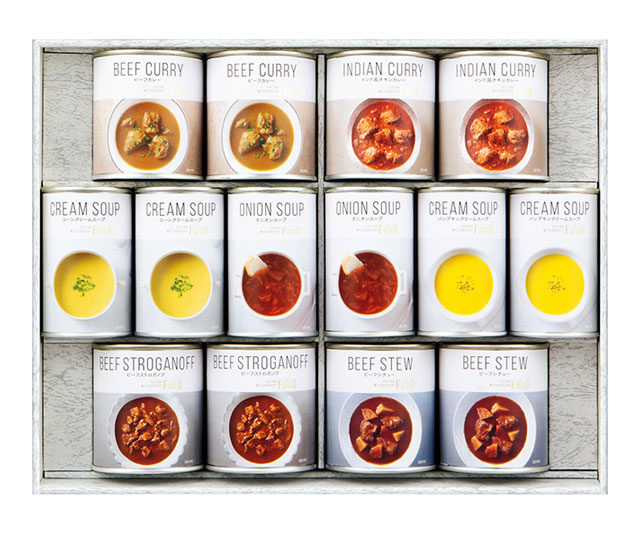 - ビーフストロガノフ・ビーフカレー・インド風チキンカレー・ビーフシチュー各200g×各2、コーンクリームスープ・パンプキンクリームスープ各160g×各2、オニオンスープ150g×2/プルトップ缶