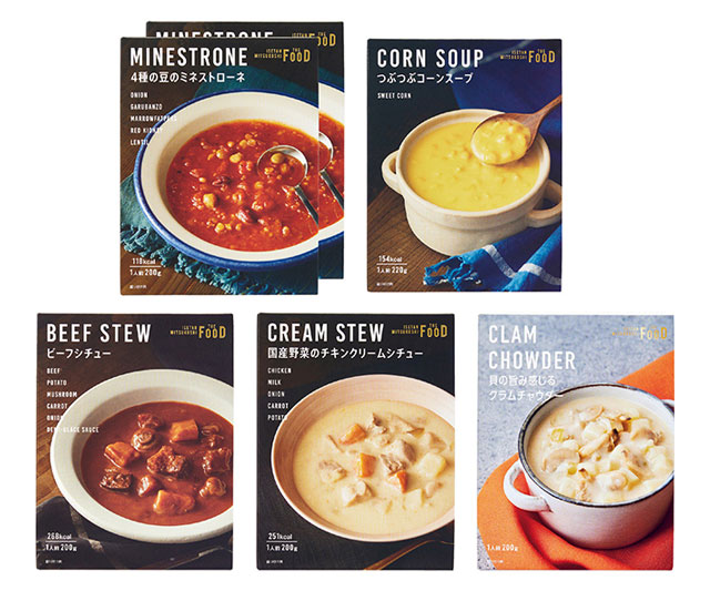 - 4種の豆のミネストローネ200g×2、つぶつぶコーンスープ220g・ビーフシチュー200g・国産野菜のチキンクリームシチュー200g・貝の旨み感じるクラムチャウダー200g×各1