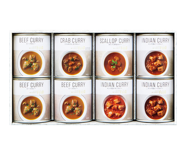 - ビーフカレー×3、インド風ビーフカレー×2、インド風チキンカレー・たらばがに入りカレー・ほたて貝柱カレー×各1、各200g/プルトップ缶